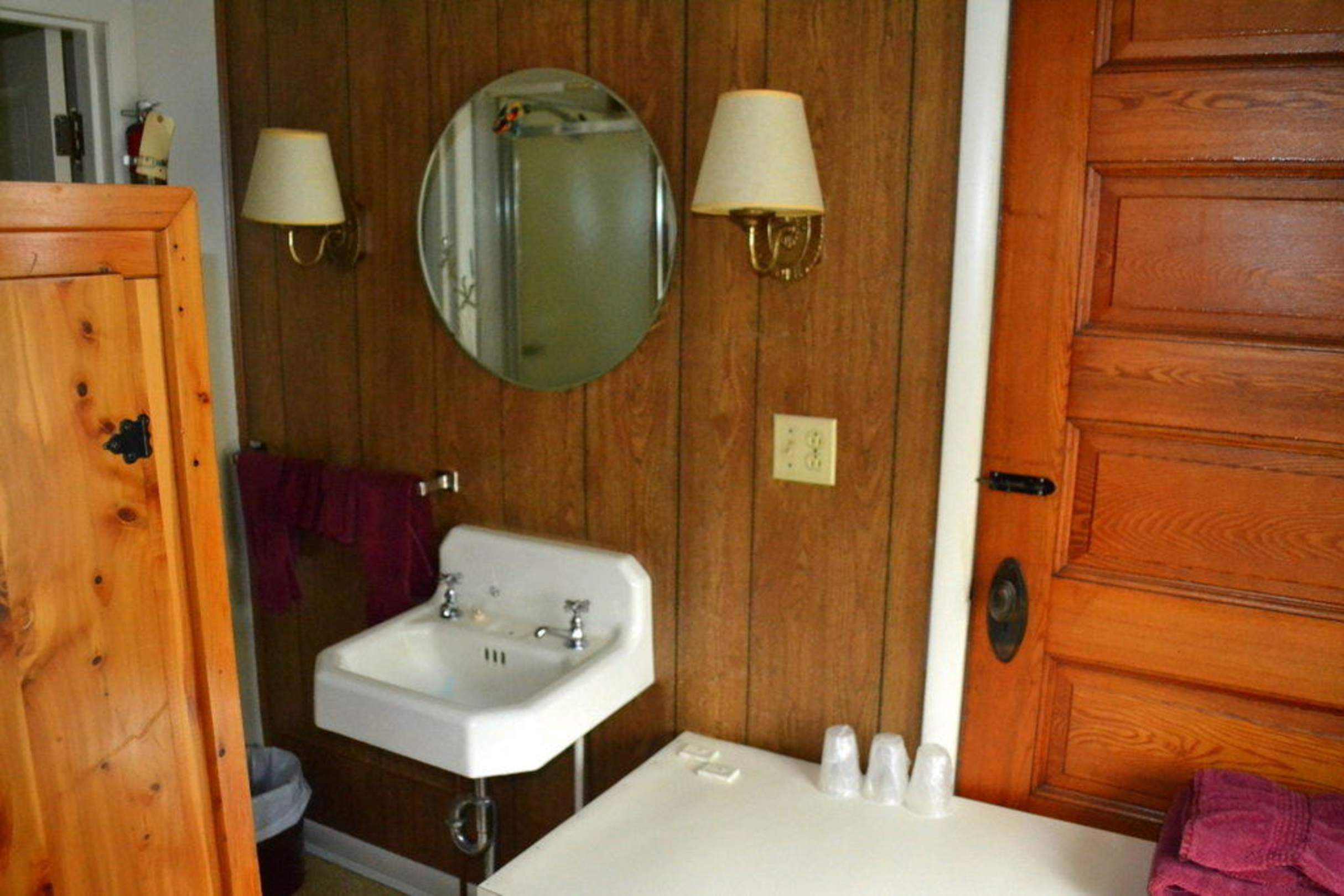 Das Waschbecken im Bad, rechts eine große Ablagefläche