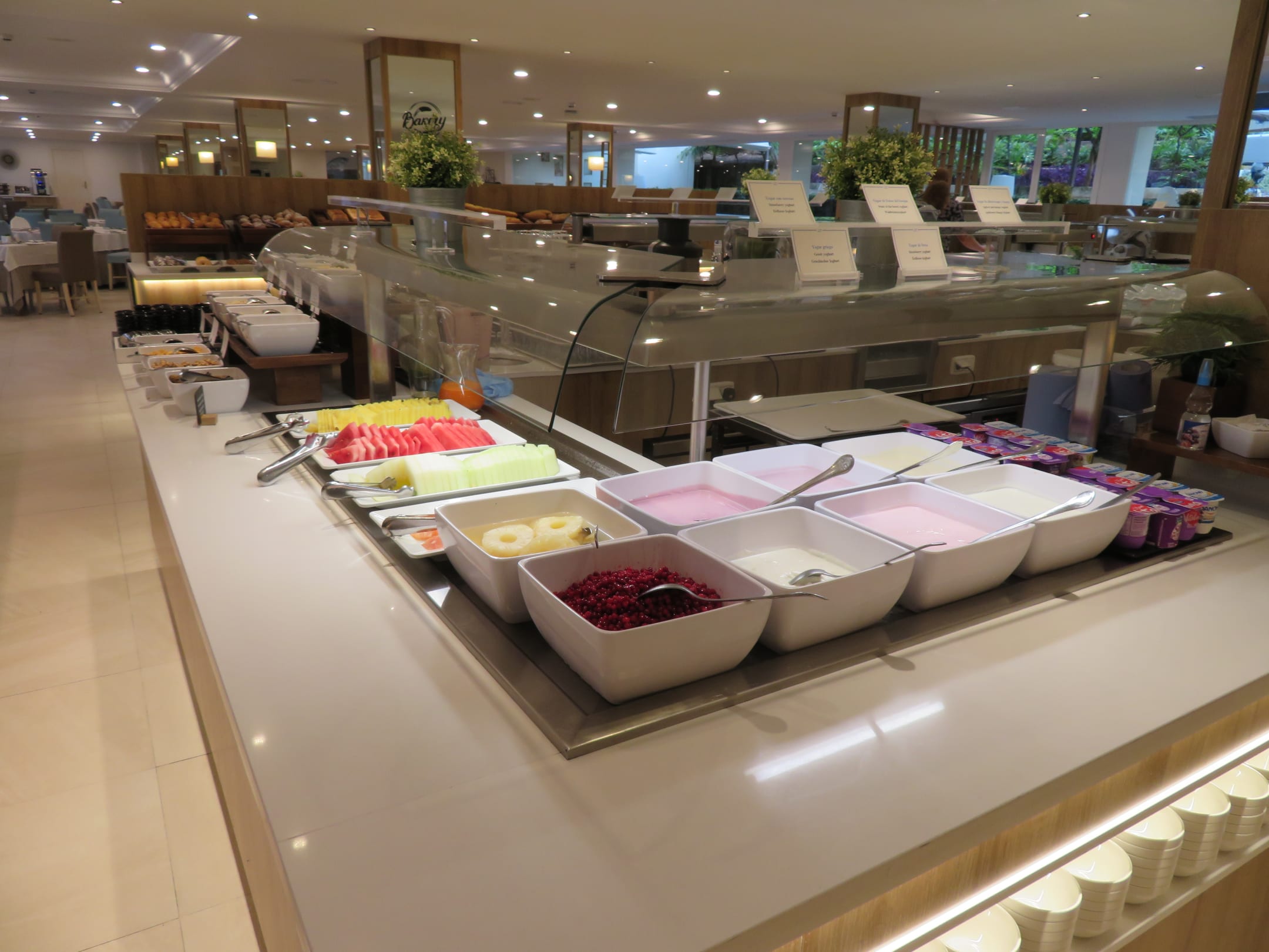 Frühstücks-Buffet mit Obst und verschiedenen Joghurts