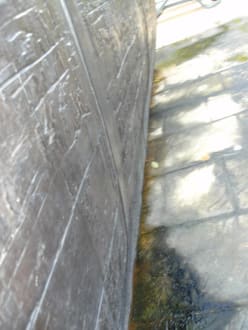 Foto zeigt eine schmierige Substanz, welche sich offensichtlich vom Piratenschiff gelöst hat. Hier laufen Kinder mit nackten Füßen entlang, um auf das Schiff zu gelangen. Vermutlich Holzlasur oder Teerfarbe.