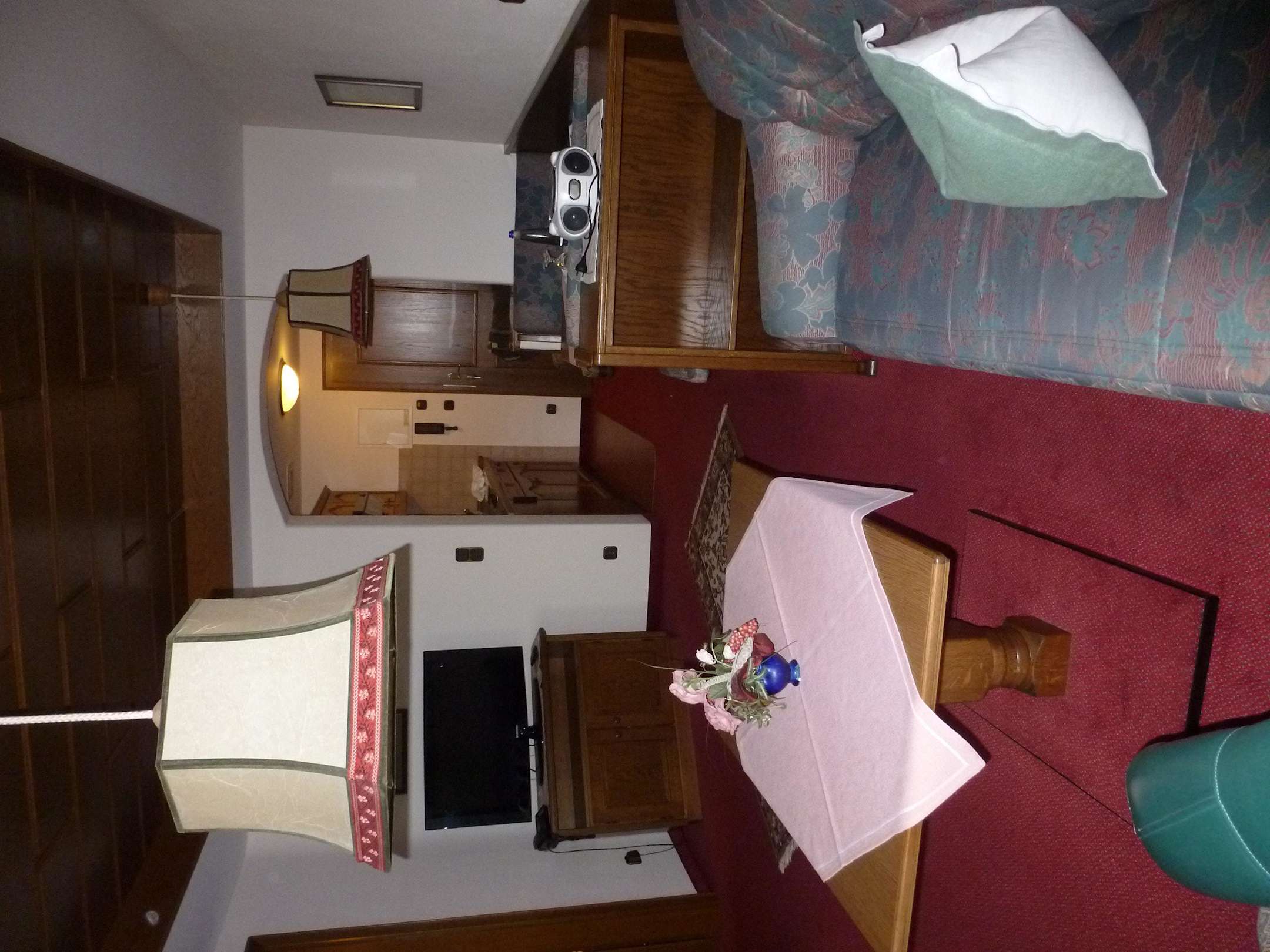 Vorne Sitzecke, dann ein Vierertisch, links zum Schlafraum und Bad, durch den Bogen Küche und Ausgang
