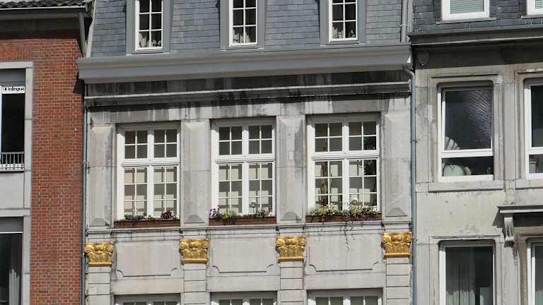 Gefallen hat mir am Rathausmarkt der große Brunnen mit der Statue Karls des Großen. Die Statue ist eine Kopie. Das Original war zur Zeit meines Aufenthaltes im Stadtmuseum Centre Charlemagne zu sehen – nicht im Krönungssaal des Rathauses wie in meinem Reiseführer zu lesen. Weiterhin gefielen mir sehr die schönen Häuser dem Rathaus gegenüber: „Zum Goldenen Einhorn“, „Zum Goldenen Schwan“ und das Haus Löwenstein aus dem 14. Jahrhundert mit seinen Wappen (aufgemalt) oben an der Fassade. Diese Wappen stehen für die früher unabhängigen Ortschaften, die später eingemeindet wurden – darunter Burtscheid, das den Schwan im Wappen trägt. Dieser Schwan ist auch ganz oben rechts an einem Türmchen des Hauses zu sehen. Haus Löwenstein ist eines der ältesten Bürgerhäuser Aachens. Die Karls-Apotheke rechts daneben ist ebenfalls sehr alt: Der ursprüngliche Bau stammt aus dem 14. Jahrhundert, der spätere / heutige von ca. 1748. Ein wenig schade, dass die dem Markt zugewandte Seite des Rathauses sich nicht so schön präsentiert wie die zum Katschhof oder zu den Seiten hin.