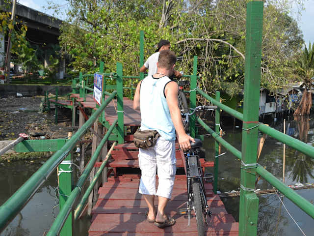 Hätte ich die Bewertungen hier über ABC Tours vor meiner Thailandreise gelesen, wäre ich nicht auf die Idee gekommen, diese Tour zu buchen und es wäre mir somit eines der Highlights meines Bangkokaufenthaltes entgangen. Nicht, dass falsch wäre, was bisher an Aussagen hier getätigt wurde, es gibt aber eben andere Sichtweisen. Nunmehr die meine: Das Büro von ABC befindet sich einer Seitenstraße der Sukhumvit Road. Unser Taxifahrer hatte einige Mühe, die Adresse zu finden, nach einigem Nachfragen funktionierte es aber doch. Gebucht hatten wir die Ganztagstour, die von 10:00 bis 15:00 dauern sollte. Im Büro gab es einen freundlichen Empfang mit Getränken und einer Vorbesprechung. Gesamtteilnehmerzahl waren 7 Personen, 4 jüngere Holländer (auch der Besitzer der Firma ist Holländer) und wir mit 16-jähriger Tochter. Die Gruppe wurde begleitet von 2 jungen Thai-Damen als Guides. Die Fahrräder waren Damenräder mit sehr aufrechter Sitzposition, was aber egal ist, da man ohnehin nur langsam fährt. Von der Vorstellung, dass in Ostasien viel mit dem Fahrrad gefahren wird, muss man sich für Thailand lösen. Wir haben während der Tour keine weiteren Radfahrer gesehen. Somit bewegt man sich einfach dort, wo Platz ist - manchmal auf Gehsteigen, machmal auf dicht befahrenen Straßen, in dunkleren Seitengassen oder auch im Menschengewühl eines Obstmarktes, überall wo man auch Motorradfahrer antrifft. Die Tour ist nichts für unsichere Radfahrer, auch Kinder unter vielleicht 12 Jahren würde ich eher nicht mitnehmen. Andererseits haben wir selbst uns nie unsicher gefühlt, als straßenquerender Fußgänger ist man eher gefährlicher dran. Ziel sind (außer 2 Tempeln) keine klassischen Sehenswürdigkeiten, im ersten Teil der Fahrt bewegen wir uns in den umliegenden Wohngegenden. Natürlich dringt man in den Seitengassen etwas in den Lebensraum der Bevölkerung ein, zumal bei den Thais aufgehängte Wäsche und andere Besitztümer oder Gerümpel auf der Straße sind, auch gegessen wird teilweise auf der Straße. Hoch interessant ist es aber in jedem Fall, und wir ernten eher freundliche Begrüßungen. Man wird sich auch mittlerweile daran gewöhnt haben, dass täglich eine Gruppe von Aliens vorbeikommt. Ein Stopp auf dem Obstmarkt beschert uns eine Verkostung von Früchten, bis wir schließlich zur angekündigten Querung des Flusses Chao Phraya mittels eines Longboats kommen. In einer Schleife des Chao Phraya befindet sich die "Halbinsel" Bang Kachao, ein Stück wenig bebautetes Gebiet mitten in der Stadt. Der Grund ist der sumpfige Boden, so dass es neben etwas landwirtschaftlicher Nutzung auch noch sehr viel Wald gibt. Neben einigen wenigen Straßen geben auf Stelzen liegende Betonplatten für uns Radfahrer den Weg vor. Nur einen Meter breit und einen halben bis einen Meter über dem morastigen Boden ist Konzentration angesagt. Die Gegend wechselt - zuerst Dschungel, unterbrochen durch wenige Häuser, dann ein Tempel, schließlich kommen wir in einen gepflegten Park mit Palmen. Dann wieder dichter besiedelt mit Straßenküchen. Dort gibt es dann auch ein köstliches Mittagessen. Die Rückfahrt verläuft dann inklusive neuerlichen Übersetzens über den Fluss eher auf kürzestem Weg zum ABC-Büro. Insgesamt jedenfalls für uns ein großartiges Erlebnis mit außerordentlich netten, umsichtigen und auskunftfreudigen Guides. Aufgrund der guten Erfahrungen haben wir dann auch noch Chiang Mai eine Radtour gemacht, die auch recht nett, aber bei weitem nicht so spektakulär wie diese war.