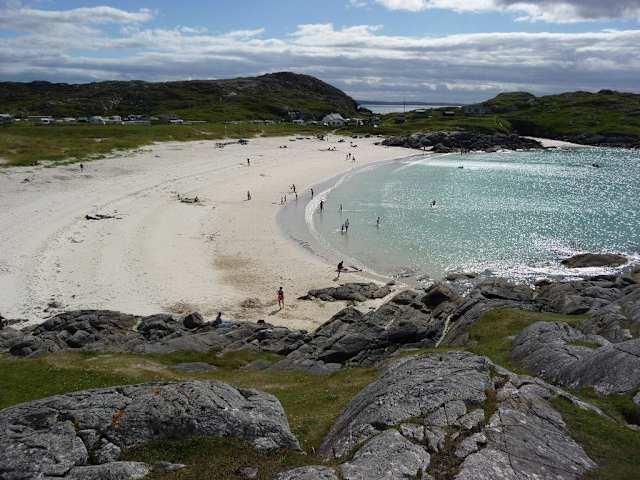 Neben den Stränden von Clachtoll findet man ein paar Meilen nördlich von Lochinver bei Achmelvich (über eine schmale Stichstrasse erreichbar) zwei wirklich schöne Sandstrände. Hinter dem grösseren befindet sich ein Campingplatz mit Jugendherberge- man kann aber über das Gelände zu einem öffentlichen Parkplatz fahren. Von dort aus sind es wenige Schritte zum Meer. Die Landschaft ist toll, der schneeweisse Sand erinnerte uns eher an Sardinien, als an Schottland. Zum Baden sind die Wassertemperaturen natürlich nicht wirklich geeignet, aber man kann hier toll für ein paar Stunden entspannen. Findet man am Hauptstrand noch verhältnismässig viele Leute, ist der zweite (über eine Schafweide erreichbare) Strand fast menschenleer. Das Wasser ist glasklar. Superschön.