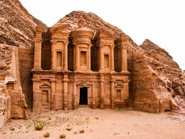Dieses erhabene Kunstwerk in der antiken jordanischen Felsenstadt Petra diente anfangs vermutlich als königliches Mausoleum. Die kunstvolle Fassade des Ad Deir wurde als ganzes Basrelief aus dem Fels der Klippen Petras, im römisch-griechischen Stil, herausgearbeitet und vermittelt noch heute einen imposanten Eindruck von den Fertigkeiten der antiken Steinmetze. Verfasst von HolidayCheck