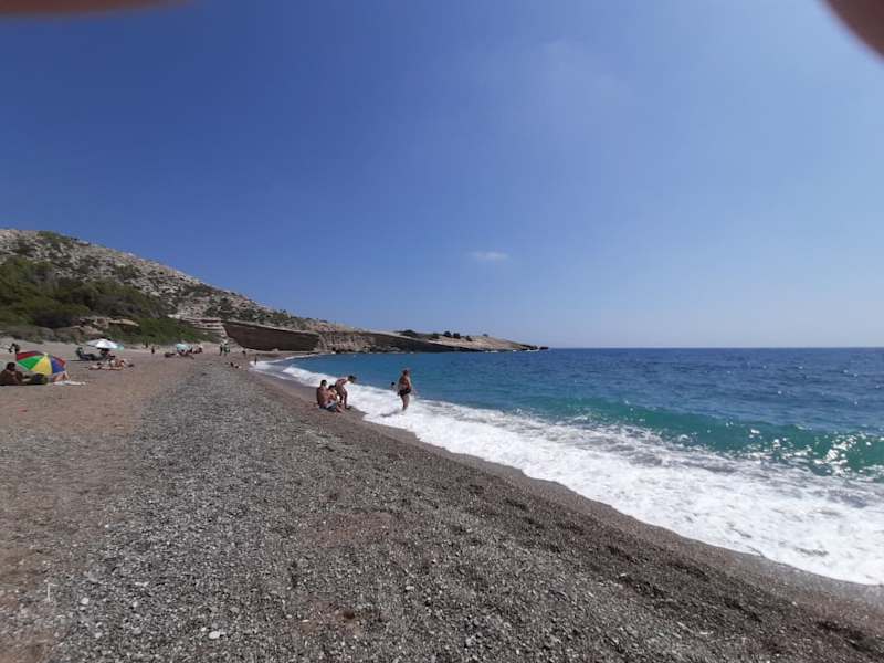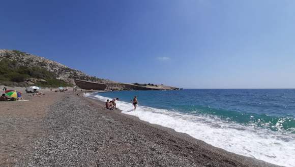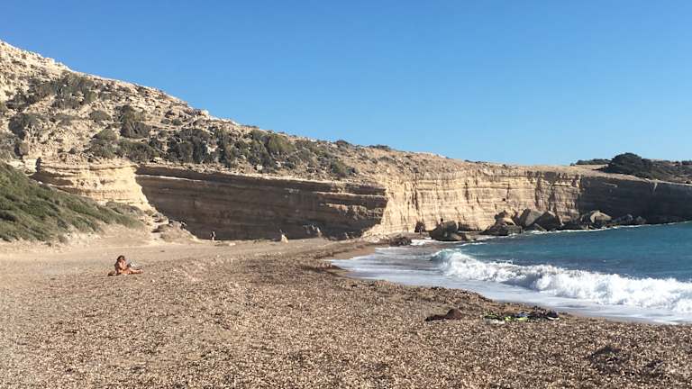 Eine recht einsame Badebucht mit Sandstrand, von Felsen eingerahmt findet man hier. Snackbar vorhanden. Mit ein wenig Kletterei kann man Höhlen anschauen. Am besten mit Mietauto oder Roller zu erreichen