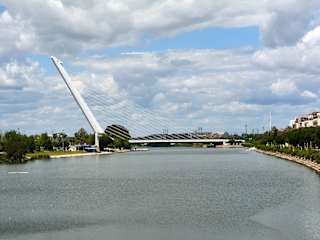 Die nach den Plänen des spanischen Architekten D. Santiago Calatrava in den Jahren 1989 bis 1992 anlässlich der bevorstehenden Weltausstellung in Sevilla errichtete "Puente del Alamillo" verbindet die Stadt mit der Insel La Cartuja über den Guadalquivir-Fluss. Dabei handelt es sich um eine etwa 250 Meter lange freitragende Schrägseilbrücke. Das gesamte Brückengewicht wird von einem einzigen 142 Meter hohen, in einem Winkel von 58 Grad geneigten Pylon durch 26 paarweise angeordnete Stahlseile getragen. Ihre Konstruktion verleiht der Brücke das Aussehen einer riesigen Harfe.