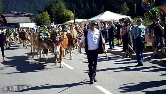 Ergreifender Zug der geschmückten Tiere von der Alm zum Heimatstall in Begleitung vom Alphornbläsern und anderen Folkloregruppen.