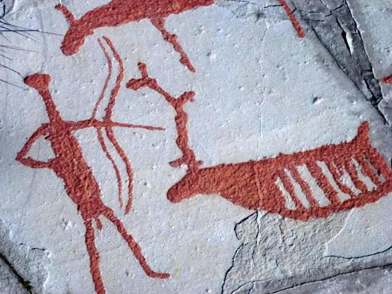 Rote Bilder auf grauem Fels