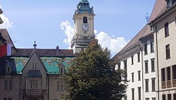 Das historische Rathaus am Hauptplatz im Zentrum der Altstadt stammt aus dem 14. Jahrhundert und ist eines der ältesten Gebäude der Stadt. Das ursprünglich als Wohnhaus eines Richters erbaute Haus wurde erst ab 1434 als Rathaus genutzt, nachdem die Stadt es gekauft hatte. Auffallend ist der Wehrturm, der zusammen mit dem ehemaligen Haus des Richters und mehreren anderen Gebäuden zu einem umfassenden Rathauskomplex wurde, der seit 1868 das Museum der Stadtgeschichte Bratislavas beherbergt.