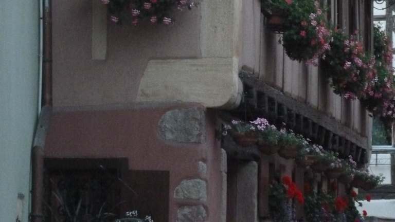 Schöne Fachwerkhäuser, ein Blumengarten, imposante Kirche, schöne Gassen und Gastronomie, nicht so gut besucht wie Colmar. Über ein Tor gelangt man zur Altstadt. Zur Begrüßung schon mehrere Störche überall. Das erste Nest aufs Tor. Weitere folgten beim genauerem Hinschauen überall. So eine Freude