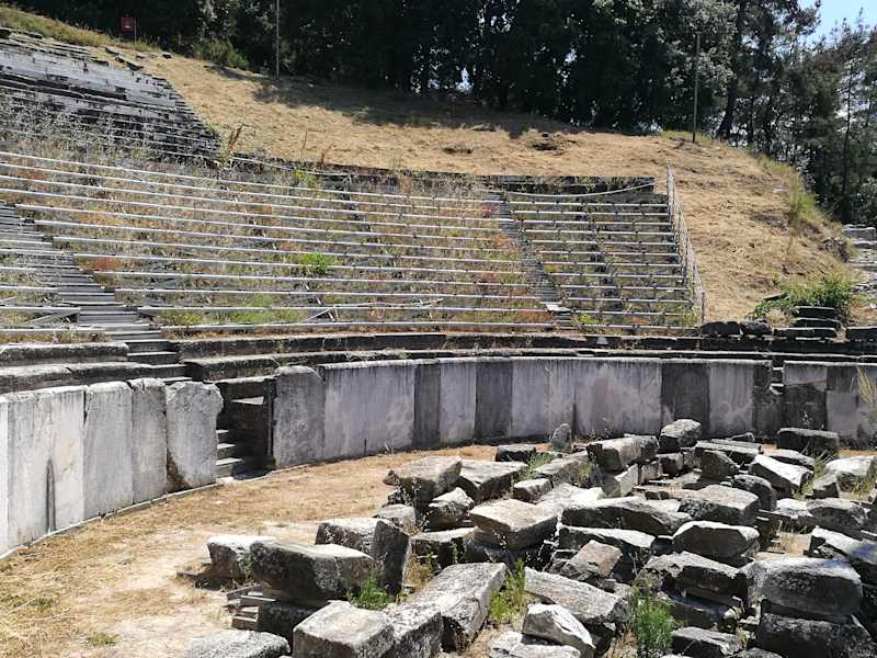 Es gibt mehrere Möglichkeiten, um zum Amphitheater zu gelangen. Ich bin am alten Kriegshafen, dem heutigen Fischereihafen, neben dem Postkartenmotiv „Kulturzentrum“ (hier auch als Reisetipp) rechts die Straße hochgegangen - ist ausgeschildert. Schon nach wenigen Metern sieht man rechtsseitig dieser Straße die Ruinen des Dionysion = „Heiligtum des Dionysos“ liegen. Man folgt weiter der Straße und kommt zu einer Treppe, die kurvig bis hoch zum Amphitheater führt. Eine weitere Möglichkeit, zum Theater zu kommen: Man geht am Kriegshafen entlang bis zum äußersten Ende, geht dort – sich rechts haltend - an einem Restaurant vorbei. Oberhalb des Restaurants liegt die Apostelkirche. Man klettert die ca. 3 m hinauf und sieht rechtsseitig einen Weg liegen, der – an der alten Stadtmauer entlang – hinauf zum Amphitheater führt. Dritte Möglichkeit: Man nimmt die hinter dem o. e. Kulturzentrum am Berg entlang verlaufende Straße Petrou Axioti, kommt dort schon nach wenigen Metern am links liegenden Wagen-Tor (Gate of Goddess on Chariot) und am rechts liegenden Poseidonion / Possidion vorbei. Ca. 150 m weiter senkt sich die Straße. Linksseitig findet man zuerst das Hermes-Tor (Gate of Hermes and Charites), rechtsseitig schräg gegenüber Ruinen des Nordviertels. Man folgt dem Weg, der sich nach max. 200 m letztendlich als der Weg „entpuppt“, der oben unter „weitere Möglichkeit“ beschrieben wurde :-) Zum Amphitheater: Zur Zeit meines Besuches wurden dort Arbeiten vorgenommen. Man konnte allerdings den größten Teil der Anlage problemlos betreten. Das Theater liegt hoch am Berghang und der Blick ab dort über den früheren Kriegshafen ist ein wunderschöner. Laut Infotafel vor Ort wird davon ausgegangen, dass das Theater aus dem späten 4. Jh. / frühen 3. Jahrhundert vor Christus stammt. Während der Zeit der römischen Herrschaft auf der Insel sollen ab ca. dem 1. Jh. nach Chr. hier auch Gladiatorenkämpfe stattgefunden haben. Ab dem 2. J. nach Chr. kam es dann auch zu baulichen Veränderungen - das Theater wurde zur Arena. So wurden z. B. die untersten Sitzreihen abgebaut und an deren Stelle eine Marmormauer hochgezogen, um die Sicherheit der Besucher zu gewährleisten. Anmerkung: Die „French Archaeological School of Athen“ begann schon 1920 mit den Ausgrabungen des alten Theaters. Diese „Schule“ zeichnet lt. diversen Quellen verantwortlich für alle Ausgrabungen in Liménas.