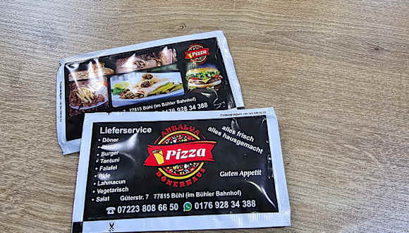 Donnerstag, 01. August 2024 abends Das Antalya - Pizza - Dönerhaus von Bühl hat direkte Bahnhofslage vor Ort und ist nun schon seit einigen Jahren etabliert in der Dönerszene. Man kann vor Ort essen, vorab telefonisch bestellen und selbst abholen oder per Lieferservice bestellen. Die Karte wurde Stand: 01.08.24) etwas umgestellt und es gibt keine Nudelgerichte mehr vor Ort in der Karte. Bestellung: 35 - Pizza Frisch > mit Thunfisch, Champignons, Zwiebeln >> 30cm für 11,00 € Softdrink 0,5l für 2,50 € Zum Essen vor Ort, hat man die Wahl innen oder außen zu sitzen - an meinem Besuchstag, war es sehr sehr warm und im Innern staute sich die Hitze - der Besitzer hat sehr gut reagiert und einen Außenplatz angeboten. Die Pizza wird vor Ort selbst zubereitet und diese war schön hell und knusprig gebacken. Geschmacklich sehr sehr gut und ich würde diese jederzeit wieder bestellen. Zum Essen, wird vom Personal zusätzlich Feuchttücher beigelegt, zum Reinigen der Hände > finde ich in dieser Form einmalig und erstklassig und mir gefällt es. Preislich ist das Antalya - Pizza - Dönerhaus im normalen Rahmen für das Ambiente und von mir eine Empfehlung wert.