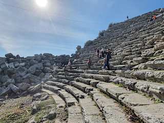 Immer noch begeistert von der Sicht in den Köprülü Canyon (siehe dort) waren wir mit den Pickups (Amaroks) 1000 m über dem Meer nahe bei den Resten des römischen Theaters in Selge. Die Fahrt dahin war prima und abwechslungsreich. Dort oben waren wir aber enttäuscht. Weniger von den alten Steinen und den Geschichten die Murat, der Reiseleiter, dazu erzählte, sondern von den Dorffrauen, die einen regelrecht bedrängten, um uns Armbänder, Handschuhe, Mützen usw. zu verkaufen. Woanders haben wir solch eine penetrante Aufdringlichkeit nicht erlebt. Wir haben uns beeilt aus ihrer Nähe zu kommen.