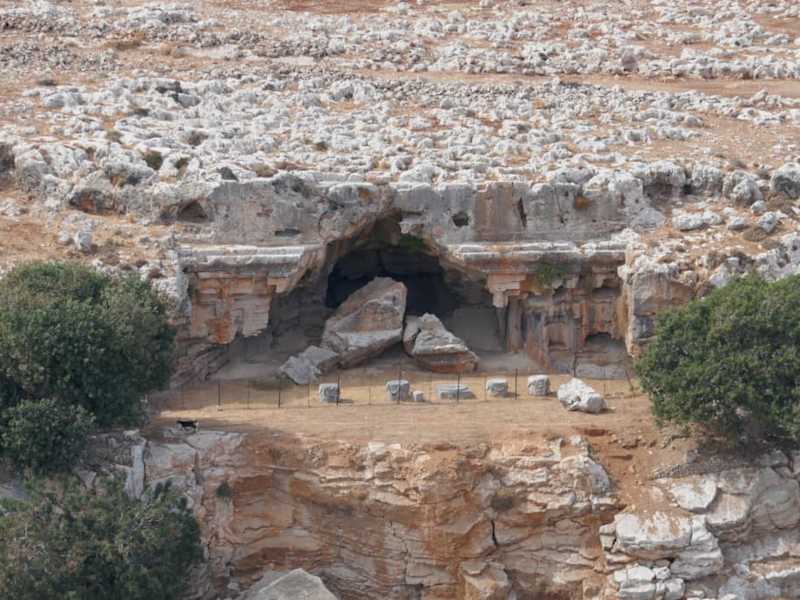 Das Grabmal eines Priesters aus der hellenistischen Zeit ca. 225 Jahre vor Chr. war wohl derjenige der das Heiligum der Athene verwaltet hat. Heute interessiert keinen der Touristen dieses Grabmal, welches noch weiter Gräber daneben hat, ist es doch mehr oder weniger völlig verfallen. Es ist in den Felsen geschlagen. Es wude durch ein Erdbeben 1841 völlig zerstört. Es lieg praktisch gegenüber der Akropolis in nordwestlicher Richtung am Rande der Stadt. Da hinauf will dennn wohl niemand mehr gehen, der den Aufstieg zu Fuß auf die Akropolis gemacht hat, er kommt zurück in die Altstatd und dort wird er völlig abgelenkt von weiteren Strapazen. Mit einem guten Fernglas kann man die Umgebung dort von der Akropolis sehen, ich habe 2 Fotos mit starkem Tele gemacht und hier gepostet.