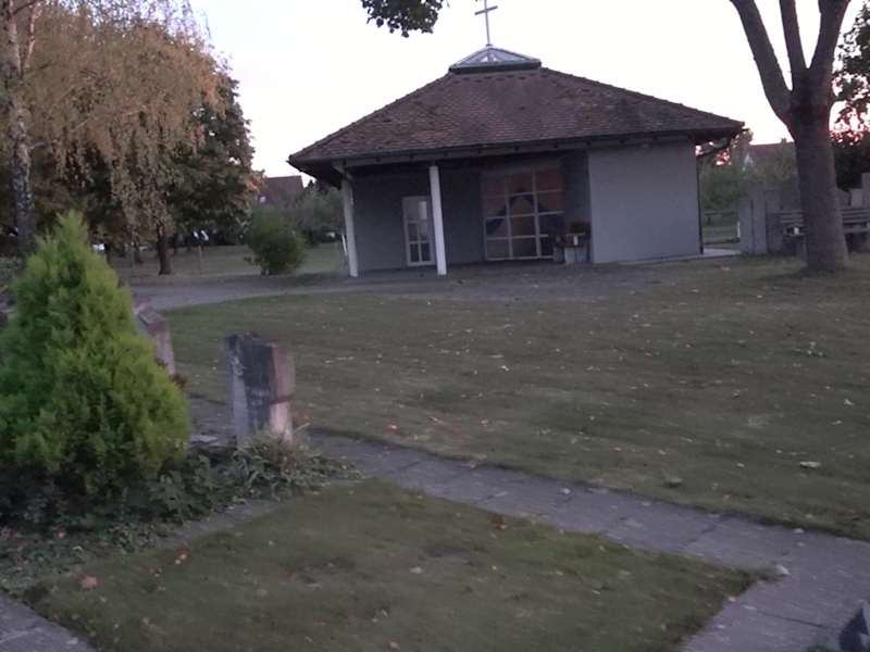 Links vom Parkplatz am Friedhof steht die Aussegnungshalle. Es ist ein viereckiges Gebäude, die Frontseite ist über Eck offen. Am Eck ist eine große Glasfront. Die Dachform ist ein Zeltdach, in der Mitte des Daches steht ein Kreuz. Adresse: Coburgstraße, 72108 Rottenburg am Neckar Webseite: https:// www. rottenburg. de/friedhof+schwalldorf.28383. htm Geodaten: FV3H+68 Rottenburg am Neckar