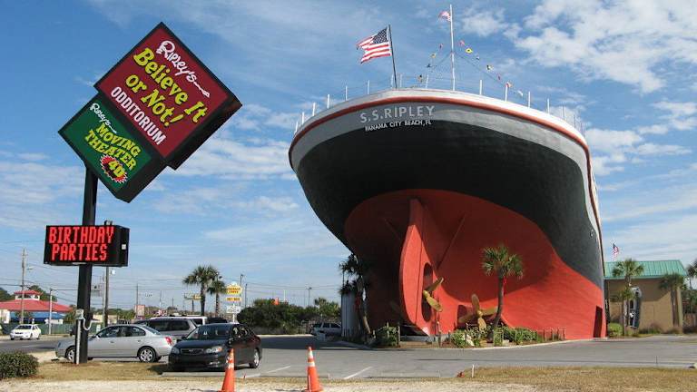 Das seit 2006 bestehende "Ripley's Believe It or Not" von Panama City Beach befindet sich an der Kreuzung von Front Beach Road und Thomas Drive in einem dreistöckigen Bauwerk, das einem auf den Strand gelaufenen Luxus-Kreuzfahrtschiff der 1950er Jahre nachempfunden ist. Dessen Gründer, Robert Ripley, suchte/sammelte in allen Weltgegenden aus dem normalen Rahmen fallende Artefakte, optische Illusionen und Kuriositäten. Das "Museum" ist in vier unterschiedliche Bereiche aufgeteilt: - Das "Odditorium", ein Kuriositätenkabinett, zeigt in Themengalerien über 500 Exponate, darunter einen Schrumpfkopf, den Untergang der "Titanic" und eine Captain-America-Statue aus weggeworfenem Schrott. Das Odditorium ist eine perfekte Mischung aus Edutainment und Interaktivität. - Das 4D Moving Theater, ein Kunstbewegungssimulator, in dem man die Gelegenheit hat, zum "Filmstar" zu werden. - Die "Impossible LaseRace", ein Labyrinth, in dem man keinen der grünen Laserstrahlen unterbrechen darf. - Der "Mirror Maze", ein Labyrinth ais Spiegeln und LED-Leuchten. Außerdem gibt es einen Kinderspielbereich. Öffnungszeiten und Eintrittspreise siehe Homepage: https://www.ripleys.com/panamacitybeach/
