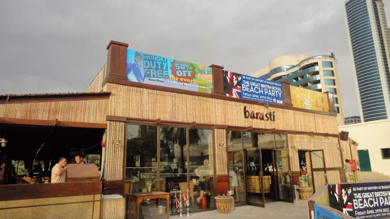Die barasti bar liegt direkt am Strand mit Blick auf die Jumeirah Palm. Ein Ort in Dubai wo Alkohol ausgeschenkt wird jedoch zu einem saftigen Preis. Zum Beispiel kostet ein corona 11€. Trotzdessen ist es ein schöner Ort zum feiern. Im oberen Bereich gibt es eine Bühne mit live Band und unten am Strand gibt es einen dj mit zum Beispiel Electromusik. Zum entspannen laden die liegen am Strand ein. Wenn man möchte kann man auch shisha rauchen. Die Bar liegt direkt hinter dem meridien Hotel. Direkt vor dem Hotel liegt die Tram die nachts bis 1uhr fährt.