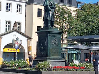 Das Beethoven-Denkmal auf dem Münsterplatz wurde 1845 aufgestellt – pünktlich zum ersten Beethovenfest und auch zur Erinnerung an Beethovens 75sten Geburtstag. Der Enthüllung sollen König Wilhelm der IV. von Preußen und Königin Victoria von England ab dem Balkon des damaligen Palais Rademacher (später Deutsche Reichspost) beigewohnt haben. Das Denkmal vor diesem schönen Bau ist auf dem großflächigen Münsterplatz zweifelsohne ein echter Hingucker. Sehr schön. Zu den Figuren am Sockel: Sie stehen sinnbildhaft für die vier Musikgattungen Phantasie, dramatische und geistliche Musik und für die Symphonie. In den Grundstein des Denkmals sollen die Erstausgaben der 9. Symphonie und der „Missa solemnis“ eingemauert sein. Quelle: Bonn an einem Tag / Lehmstedt Verlag