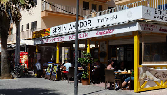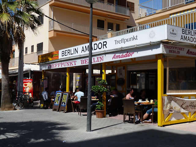 Cafe - Restaurant Berlin Amador! Gelegen in der Seitenstraße C/ Mission Santa Barbara Nr. 3, ( zwichen Ball. 6 und 7), ist das Schwester - Restaurant vom Cafe Berlin III am Hotel Pilari Playa ( Ball. 11 ). Versehen mit einer netten überdachten Terrasse, auf der man je nach Jahreszeit ab 9 Uhr ein schönes Sonnenplätzchen für den morgentlichen Cafe einnehmen kann. Es handelt sich um ein Selbstbedienungsrestaurant mit sehr freundlicher Buffetöse, welche über gute Deutsch-Kenntnisse verfügt. Das freundlich ausgestattete Restaurant ladet natürlich nicht nur zum Morgenimbiss ein. Das Angebot der Hauptgerichte wird recht apetitlich in der Thekenauslage präsentiert. Das Angebot fing beim gut belegten Mettbrötchen (€ 1.50 ) mit und ohne Zwiebel oder Schinken ( roh od. gekocht ) an. über Curry - Wurst mit Pommes und Salatbeilage nach Wahl (rd. €4.--) Frikadellen mit Gemüse, Eisbein m.Sauerkraut, Haxe, Rouladen, etc.etc. Alle Speisen zu sehr zivilen Preisen. Es handelt sich natürlich nicht um ein 5 Sternerestaurant, daher ist die Optik der Tellergerichte eher schlicht und einfach. Die Mädels vom Buffet sind so nett und bringen die Tellergerichte auch nach draußen, trotz S.B. Kaffee ( Pott )und Kuchen ( große Stücke ) sind immer im Angebot und kosten ca.€ 2.-- ! Pott Kaffe mit Milch € 1.10, Cola / Limo im 0,3 Glas € 1.50, heiße Schokolade € 1.60 usw. Die Speisekarte geht preislich nicht über € 10.-- und bietet fast ausschließlich deutsche Gerichte an.