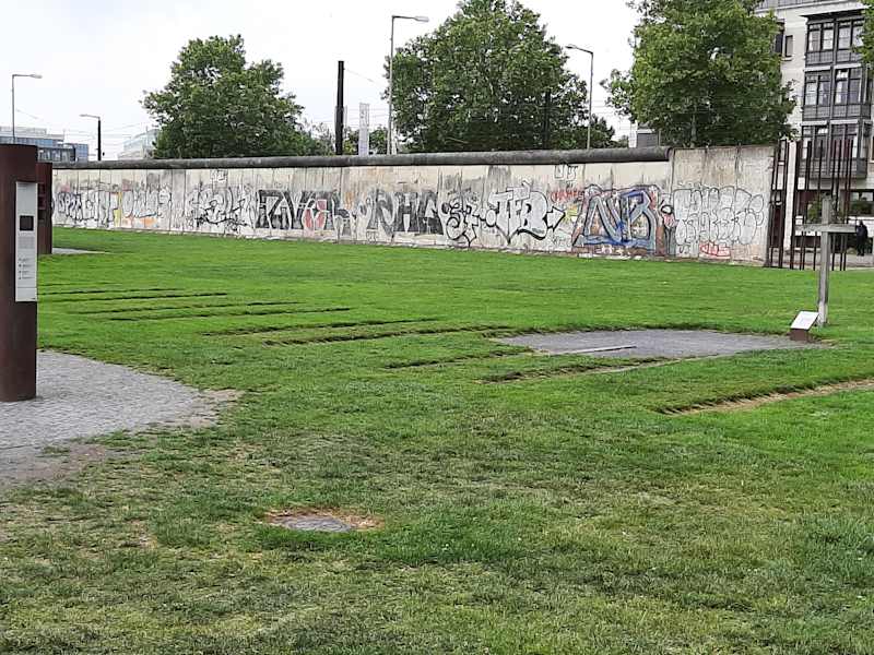 Von der ehemaligen Berliner Mauer, die die Stadt 28 Jahre trennte, sieht man heute nicht mehr viel. Am beeindruckendsten und bedrückendsten ist sicherlich das wiederaufgebaute Mauerstück der „Gedenkstätte Berliner Mauer“ in der Bernauer Straße (mit vielen Beschriftungen, Informationen, Ausstellungsstücken, Erinnerungstafeln, Kennzeichnung ehemaliger Fluchttunnel usw.). Dagegen ist die East Side Gallery mit den vielen Bildern auf ca. 1,5 km Mauerlänge richtig befreiend. An diversen Stellen in der Stadt findet man immer mal wieder einzelne Mauerelemente (wie z.B. z.Zt. am Potsdammer Platz). Wer dort, wo einst die Mauer verlief, manchmal seinen Blick nach unten auf den Boden richtet, wird immer mal Platten sehen, die den Verlauf der Mauer anzeigen (z.B. am Brandenburger Tor, hinter dem Bundestag/Reichstag usw.).