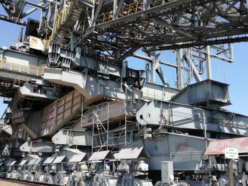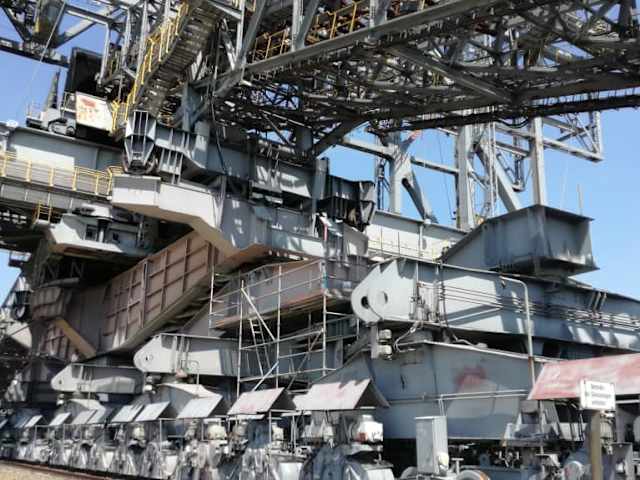 Da mein Mann dienstlich in Finsterwalde beschäftigt war, besichtigte ich alleine das Besucherbergwerk F60 in Lichterfeld bei Finsterwalde. Die F60 ist eine Abraumfördermaschiene für den Kohletagebau. Sie ist 502 Meter lang, 202 Meter breit und rund 80 Meter hoch. Sie überspannte einst den Tagebau, legte das Kohleflöz mit Eimerkettenbaggern frei und transportierte den abgetragenen Abraum über Bandanlagen zur Kippe auf der anderen Seite. Die eigentliche Kohleförderung wurde unter dem Stahlkoloss durch andere Bagger realisiert. Die Abtragsmächtigkeit der beiden Bagger im Hoch- und Tiefschnitt betrug insgesamt 60 Meter, daher der Name F60. Sie war vom März 1991 bis zum Juni 1992 im Einsatz. Danach sollte sie eigentlich verschrottet werden. Besucher können sich in einen Besucherzentrum allgemein über den Tagebau und über die F60 informieren. Es werden verschiedene interessante Kurzfilme gezeigt. Das Beste ist natürlich die Besichtigung der Fördermaschine im Rahmen einer Führung. Da ich alleine war, konnte ich mich einer Gruppe anschließen. Gruppen sollten vorab eine Führung anmelden, ansonsten muss man evt. warten. Die Führung dauert etwas mehr als eine Stunde. Insgesamt läuft man rund 1,3 Kilometer und überwindet 80 Höhenmeter. Vom höchsten Punkt der F60 hat man eine tolle Sicht auf die Umgebung. Laut unserer Führerin konnten wir bis in die Sächsische Schweiz schauen. Besucher müssen schwindelfrei sein.