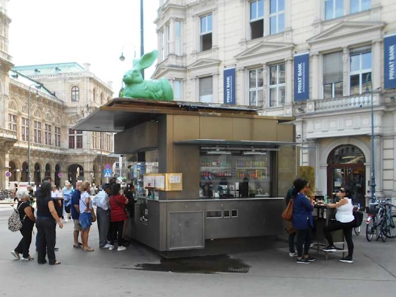 Der Würstchenstand zwischen der Oper und der Albertina ist dafür bekannt, dass hier auch schon mal frühmorgens Prominente für einen Imbiss vorbeischauen, wenn sie vom Opernball kommen. Aber auch wer nicht prominent ist, findet hier eine große Auswahl von Würsten, Hot Dogs, Leberkäs-Semmeln usw. Und – für eine Würstchenbude eher ungewöhnlich – wer mag, bekommt dazu auch ein Glas Champagner.
