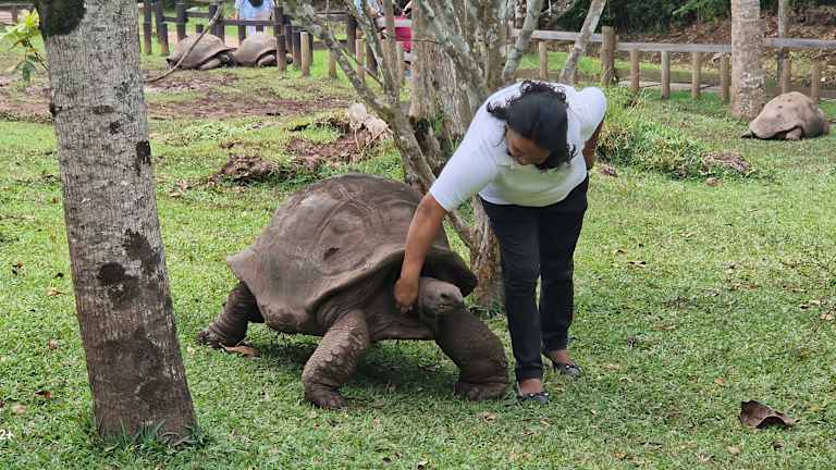 Wir hatten einen Tagesausflug mit der ortsansässigen, deutschen Reiseleiterin Brigitte M. (brigitte.maurice@hotmail.com) gebucht. Sie ging absolut auf unsere individuellen Wünsche ein und machte keinen Zeitdruck, wenn wir außer den geplanten Besichtigungen für besondere Besorgungen Stopps wünschten. Wir besichtigten die Caldera von Trou aux Cerf, eine Modellschiff-Werkstatt, das Grand Bassin, das Hindu-Heiligtum Ganga Taleo, die Rhumerie in Chamarel, den Wasserfall dort und die Sieben farbige Erde. Wir machten Lunch im La Marmite de Chamarel. Obwohl uns die Sonne wenig gutes Fotolicht spendete, war es ein langer und gelungener Tag. Die deutschsprachige Führung war ein Gewinn, weil sie auch einen hohen Untewrhaltungswert hatte.