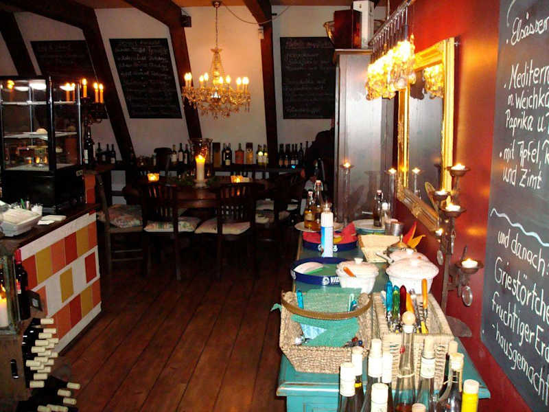Kleines, unauffällig gelegenes "insider"-Lokal in Cuxhaven mit romantischem Ambiente und wunderschöner Dachterasse. Besonderer Wert wird auf das Angebot ausgesuchte dabei aber preisgünstiger Weine gelegt. Dazu gibt es einfache schmackhafte kleine Gerichte im Tapas-Stil. Angeschlossen ist ein Modegeschäft in welchem zusätzlich sehr empfehlenswerte mediterrane Feinkostartikel angeboten werden. Sehr persönlicher, freundlich-umsichtiger Service. Das Lokal wird vorwiegend von Cuxhavener Stammkundschaft besucht. Optimale Adresse für einen schönen Abend mit Freunden bei einem guten Glas Wein.