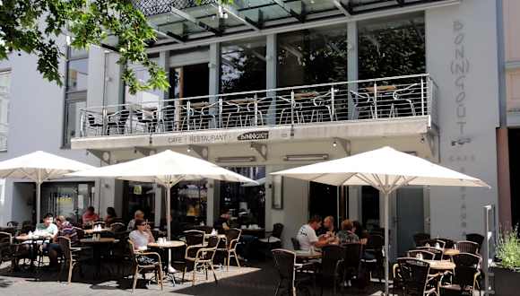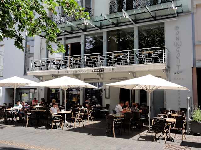 Das Café „Bon(n)goût“ liegt am Remigiusplatz in der Bonner Innenstadt, einen Katzensprung von der Universität entfernt. An zahlreichen Tischen und geschützt von großen Sonnenschirmen, lässt sich hier von morgens bis in die späte Nacht auf äußerst angenehme Weise das Leben beobachten. Unter der Woche sitzt man am Vormittag vis-á-vis des Blumenmarktes, während das Frühstück serviert wird. Die Speise- und Getränkekarte ist vielfältig, allein die Frühstücksangebote füllen 2 Seiten und hier dürfte wohl jeder etwas finden, was seinem Geschmack entspricht. Croissants, Rührei, französische Konfitüre und sogar norwegischer Fjord-Lachs stehen unter anderem in den verschiedenen Kategorien bereit. Die Nähe zur Uni beschert dem „Bon(n)goût“ ein aufgeschlossen-interessiertes Publikum bis in die Nacht. Ab dem Mittag hält die Küche zahllose Salate, Pasta- und Bistrogerichte vor – Tages- und Saisonkarten ergänzen das Spektrum. Der Service ist unkompliziert und kompetent, so dass man sich als Gast wirklich wohlfühlen kann. Preislich liegt das „Bon(n)goût“ im Rahmen seiner Mitbewerber und scheint mir einen Reisetipp wert zu sein.