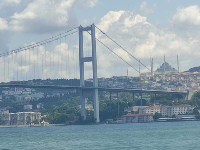 Die „ Erste Bosporus Brücke“ wurde im Jahre 1973 eröffnet und wird auch Bogaz Köprüsü Brücke genannt. Sie verbindet , über eine Autobahn , den europäischen Teil Istanbuls mit dem asiatischen Teil. Sprich die Stadtteile Besiktas mit Üsküdar. Es handelt sich um eine Hängebrücke mit insgesamt 6 Fahrstreifen --- die aber nicht richtungsweise eingesetzt werden, sondern dem Verkehrsaufkommen angepasst werden. Es kann dann zeitweise vorkommen, dass 4 Fahrstreifen für die eine Richtung geöffnet sind und nur zwei für die andere Richtung. Sie besitzt noch zwei Notstreifen sowie einen Fußgängerweg. Insgesamt ist sie 64 Metern hoch, so das auch noch Kreuzfahrschiffe unter ihr passieren können. Sie besitzt eine Länge von 1560 Metern sowie eine Spannweite von 1074 Metern. Fährt man mit dem Auto über die Brücke, kommt es einem überhaupt nicht so vor ,als wenn man eine Brücke überquert. Allerdings vom Wasser aus --- z.B. von einer Fähre, hinter lässt sie schon ein bombastischen Eindruck.