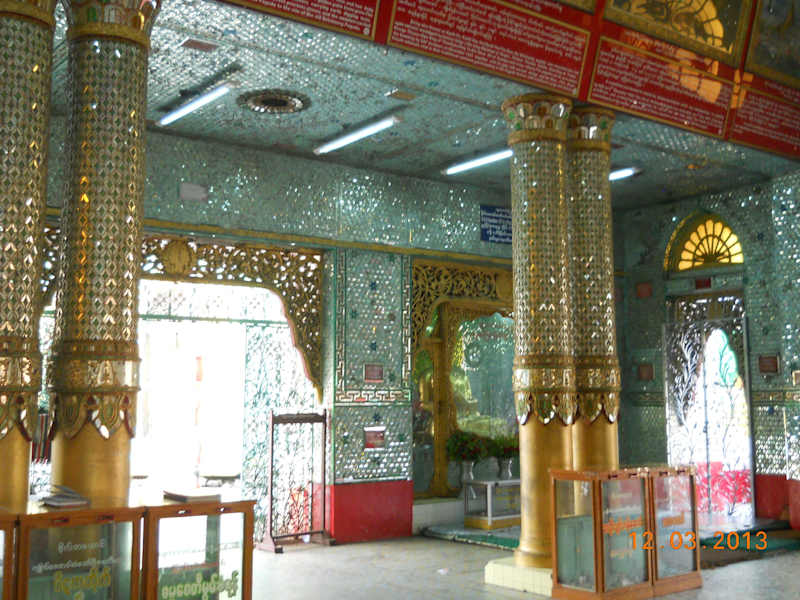 In der Nähe des Yangon Rivers liegt die Botataung Pagoda. Übersetzt bedeutet der Name "tausend Offiziere". Der Legende nach sollen diese die Reliquien Buddhas begleitet haben, als sie vor über 2000 Jahren aus Indien hierher gebracht wurden. Die begehbare Stupa wurde Ende des 2. Weltkrieges durch Bomben zerstört. Bei den Aufräumarbeiten barg man unter den Trümmern in einer Kammer, kostbare Artefakte. Man fand auch Reliquien die Buddha zugeordnet wurden, unter anderem eine kleine goldene Stupa, die ein Haar Buddhas enthielt. Da auf einigen Artefakten die Schriften und Schutzgeister der Mon abgebildet waren, geht man davon aus, daß die ursprüngliche Pagode vor über 2500 Jahren von den Mon gebaut wurde. Nach den Aufräumarbeiten wurde sie ähnlich wieder aufgebaut. Das Gelände umfasst ausser der begehbaren Stupa auch andere Gebäude u. kl. Pagoden. Die Hauptpagode ist ca. 40 m hoch und die Fahne an der Spitze ist mit Diamanten besetzt. Im Innern sind die Wände und Säulen mit bunten Glasmosaiken und Gold bedeckt. Überall stehen Spendenboxen aus Glas. Ein schmaler Gang führt zu den heiligen Reliquien. Hier sind die Wände und Decken komplett mit Blattgold belegt. Wir stellten uns in die Reihe der Gläubigen, um einen Blick auf die Reliquien zu werfen. Die kleine goldene Stupa mit Buddhas Haar ist hinter einer Glasscheibe ausgestellt. Auch ein Zahn Buddhas, den die Chinesen Myanmar als Geschenk überreichten, befindet sich unter den Reliquien. In einigen anderen Schaukästen kann man weitere Artefakte sehen (Schmuck, Figuren etc.) Draussen auf dem Gelände sitzen überall andächtig die Gläubigen ins Gebet versunken. Vor einem kleinen Steg saß ein Mann und verkaufte kleine Fische. Hier kann man sein Karma verbessern indem man einen Fisch kauft, und ihn im Gewässer darunter wieder frei lässt.