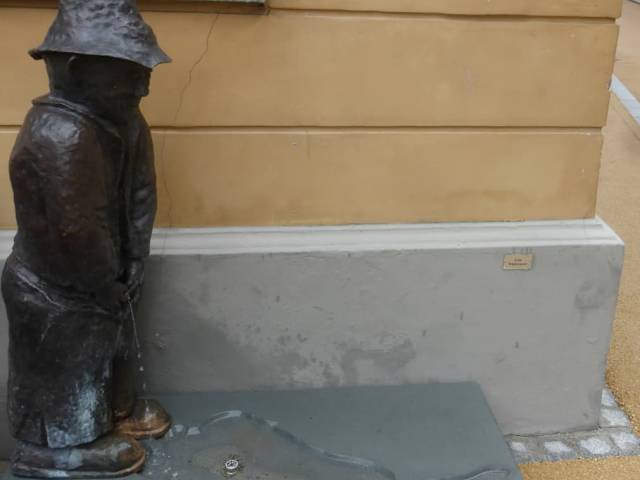 Beim Bregenzer Seebrünzler wird immer wieder der Vergleich zum Menneken Pis aus Brüssel herangezogen. Wenn, dann muss man aber sagen, dass dies in Bregenz kein Junge mehr ist, sondern es sich hierbei mehr um einen „alten Knacker“ handelt, der es verschämt laufen lässt und Mühe hat, dass er dabei nicht seine Kleidung erwischt und es nicht auf die Schuhe tröpfelt (zumindest hatte er im Mai 2019 so seine Pinkelprobleme bzw. es mangelte ihm am nötigen Druck). Nett ist in diesem Zusammenhang zudem das Schildchen an der Mauer hinter dem Seebrünzler (rechts unten) mit der Aufschrift „Kein Trinkwasser“.