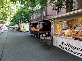 Der Kajenmarkt findet jeden Samstag von Anfang Mai bis zum letzten September-Wochenende an der Bremer Schlachte statt und ist seit 1986 eine feste Institution, um gemütlich maritim zu Bummeln, an rund 50 Ständen mit Kunstgewerbe, Geschenkartikeln, Gewürzen und Haushaltswaren einzukaufen und sich mit Fischbrötchen, belgischen Waffeln und Grillwurst zu stärken. Umlagert ist regelmäßig der Pfälzer Weinstand mit seinen genialen Flammkuchen und an der Martinikirche staunen Besucher über den Fischhändler, der in einem offenen Räucherofen Lachs, Makrelen und Aale zubereitet und ofenwarm verkauft – frischer geht es nicht! In Höhe der Teerhofbrücke bietet eine mobile Bühne ein buntes, kostenloses Live-Programm mit Chanty-Chören, Swing- und Jazz-Musik. Direkt an den Kajenmarkt schließen sich stromabwärts die Restaurants, Biergärten und Cafés der Schlachte an und „eine Etage tiefer“ findet an der Weserpromenade zeitgleich ein ausgedehnter Flohmarkt statt.
