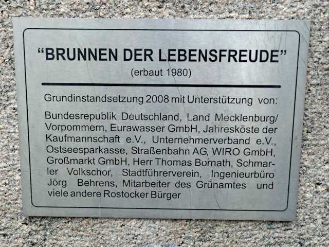 Dieser Brunnen wurde am 27.Juni 1980 eingeweiht, die Künstler D. Dietrich und Jo. Jastram haben etwas geschaffen, was wahrscheinlich nicht allen Rostockern gefällt. Da wir wissen, daß die Badenden in den Seebädern der ehem. DDR nicht gerade zimperlich mit dem Nacktbaden waren, möchten wir die Figuren, wie sie so dargestellt sind akzeptieren. Im Volksmund wird der Brunnen des öfteren als "Pornobrunnen" bezeichnet, na , na so etwas!!! Die richtige Bezeichnung soll die Einheit zwischen Mensch, Tier und Wasser symbolisieren.