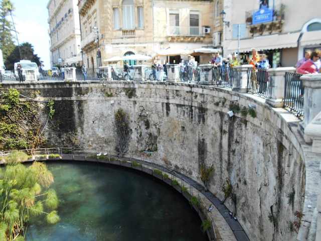 Dieser ziemlich große Brunnen liegt unmittelbar am Meer, auf der Insel Ortygia, der Altstadt von Syrakus. Wer möchte, kann der griechischen Legende folgen, aber es gibt kaum jemanden der für die alten Götter und deren Verirrungen Interesse aufbringt, allles "Kalter Kaffee", obwohl sich solche Geschichten nett anhören. Wir sehen hier eine Süßwasserquelle, direkt am Meer !!!! in welcher Fische schwimmen und sich an altem Brot gütlich tun. Hiier wachsen die einzigen Papyrusstauden in Europa, sonst kennt man diese von Ägypten