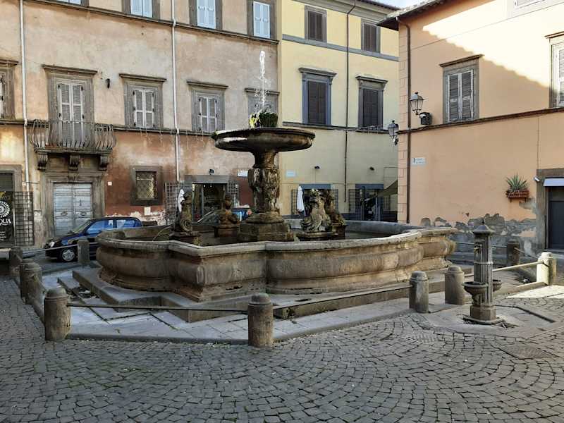 Der Brunnen im Zentrum der Altstadt von Tuscania stammt aus dem frühen 17. Jahrhundert und steht vor dem Dom. Eine schöne, kunstvolle Steinmetzarbeit.