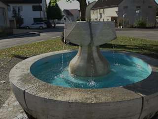 Zwischen Weitfelder Weg und Junginger Straße ist eine kleine Grünfläche mit Buchsbaumkugeln. In der Mitte steht ein Brunnen. Es ist ein rundes Brunnenbecken. In der Mitte ist eine runde Säule, oben mit drei abstehen Dreiecken. Aus den Rinnen der Dreiecke läuft Wasser in das Becken. Um das Becken stehen Parkbänke. Adresse: Weitfelder Weg, 89275 Elchingen Geodaten: C3Q2+63 Elchingen