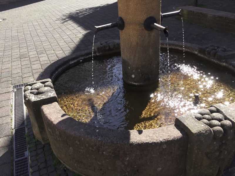 Ein wunderschöner Brunnen im Kirchhof der Protestantischen Kirche. Eine Säule mit einer Inschrift steht in einem runden Becken. Drei Wasserspeier lassen das Wasser ins Becken fliesen.