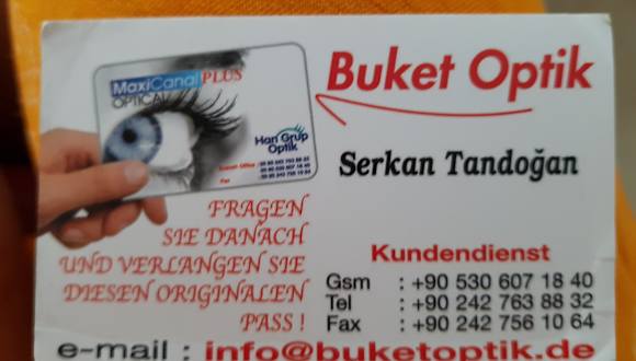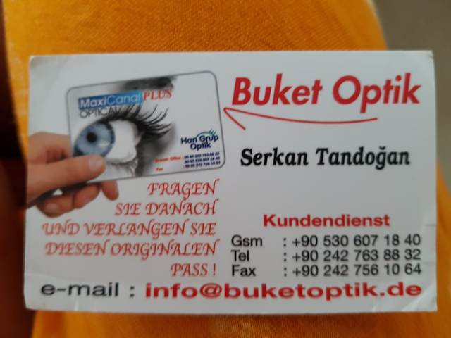 Tolles Angebot, kompetente Beratung Ich habe vor zwei Wochen (Aug. 2016) eine Gleitsichtbrille bei Buket Optik in Colakli gekauft. Ich wurde samstags zum Augenarzt gefahren und nach Ermittlung der Stärken zurück gefahren zum Optiker. Der Verkäufer Serkan Tandogan hat mich super und kompetent beraten. Mittwochs war die Brille fertig. Ich konnte sofort klar und deutlich sehen, viel besser als mit meiner vorherigen Gleitsichtbrille. Es ist alles perfekt. Nach ein paar Tagen wurde das Gestell nochmals nachgestellt. Man kann dieses Geschäft und den Verkäufer nur weiterempfehlen. Er spricht sehr gut deutsch. Ich würde jederzeit wieder eine Brille dort kaufen. Die Brillentücher, die es gratis gibt, sind übrigens super, besser als die sonst üblichen. Danke, jederzeit wieder!