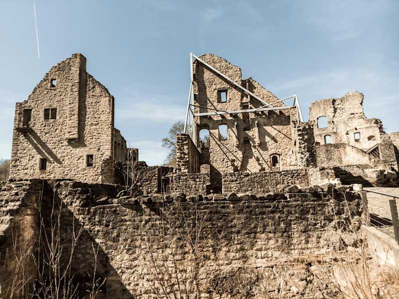 Oft bin ich an dieser Burgruine vorbeigefahren. Zu Unrecht! Dieser Tage habe ich an einem sonnigen Frühlingstag eine Visite eingeplant. Die Burgruine auf dem Plateau ist über einen Zugangsweg gut mit dem Auto erreichbar; ein Parking befindet gleich am Burgtor 1, am Eingang zum Areal. Der Eintrittspreis liegt derzeit bei erschwinglichen 4,00 EUR pro Person. Das Areal wurde in den letzten Jahren umfangreichen und aufwendigen Restaurierungsarbeiten unterzogen. Der sogenannte Kriechinger Bau am östlichen Vorsprung kann in der Tat beeindrucken. Diese sogenannte ‘Maison de Créhange’ ist heute optisch zum Wahrzeichen der Burg Fels geworden, und ein für wahr architektonisches Kunstwerk. Insbesondere auch weil dieses exquisite Gebäude eindrucksvoll restauriert wurde. Aber sicherlich heute für Geschichtsfreunde und Anhänger herrschaftlicher Burgbauten und Befestigungen ein Must als touristisches Entdeckungsziel.