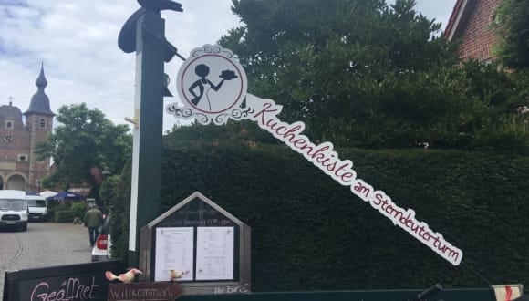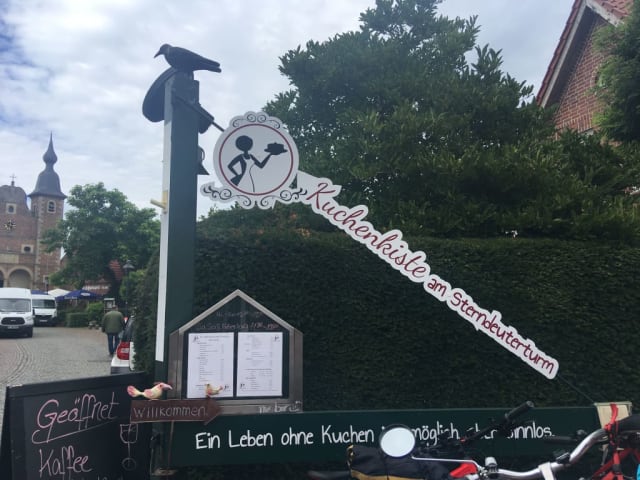 Während unserer Radtour legten wir am Nachmittag im Gastgarten des Cafés Kuchenkiste eine Pause ein. Schnell wurden für uns Tische zusammengestellt und wir konnten auch schon Platz nehmen. Unsere Getränkebestellungen wurden zügig aufgenommen und innen, an der Kuchentheke hatten wir die Qual der Wahl ;) So viele Torten und Blechkuchen standen zur Auswahl bereit. Aber schnell fand ein jeder unserer Gruppe seinen Lieblingskuchen. Diese wurden dann auch flott zum Tisch gebracht, ebenso vorab schon die Getränke. Beim Cappuccino gab es als Überraschung ein kleines Glas Kaffeelikör dazu. Die Tortenstücke waren bewundernswert groß und schmeckten uns allen vorzüglich. Zwischendurch kam auch die Chefin an unserem Tisch vorbei und begrüßte uns und auch andere Gäste sehr freundlich und nett. Vom Gastgarten aus hat man einen direkten Blick auf den Sternedeuterturm des Schlosses Raesfeld. Wer am Schloss Raesfeld unterwegs ist, sollte auf jeden Fall im Café Kuchenkiste einkehren. Es lohnt sich! Unter www. kuchenkiste.net git es Info über Öffnungszeiten und mehr.