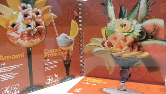 Nach einem ausgiebigen Bummel durch das Arkaden Center am Potsdamer Platz in Berlin-Tiergarten war uns bei sommerlichen Temperaturen nach einem Eisbecher zu Mute. In der ersten Etage des Berliner Einkaufszentrums fanden wir in der Eisdiele Caffè e Gelato eine Vielfalt an italienischen Eissorten die uns sofort ansprachen. Da auch das Auge mitisst und uns die Lokalität gefiel suchten wir uns in der gut besuchten Lokalität ein Plätzchen. Die Gelatieri unterscheiden bei ihrem Angebot unter vier Geschmacksrichtungen. Erstens Classic, es sind die „Klassiker“ wie die Sorten Stracciatella oder Joghurt, Vanille, Schokolade, Zitrone. Bei der Premium Sorte handelt es sich um Exoten wie Biscottino (Mascarponeeis mit Keksen und Nougatsoße) oder Fruttissimo (Kiwi-, Bananen- und Ananaseis mit Passionsfrucht-Mango-Soße). Für Gesundheitsbewusste Kunden wird Eis ohne Zucker und ohne Lactose angeboten. Bei dem vierten Angebot handelt es sich um „biologisches Eis“. Ob Pistazie, Vanille, Bacio Bianco oder andere: alle Sorten dieser Richtung sind mit dem Bio-Siegel gekennzeichnet. Wir entschieden uns für einen köstlichen Eisbecher „Coppa Prosecco“, eine Köstlichkeit aus Zitroneneis, frischen Erdbeeren und natürlich Prosecco, der in seiner Aufmachung mit den Früchten auch für das Auge eine Besonderheit und im Juli 2012 eine Erfrischung war.