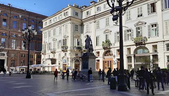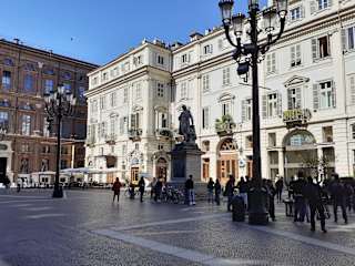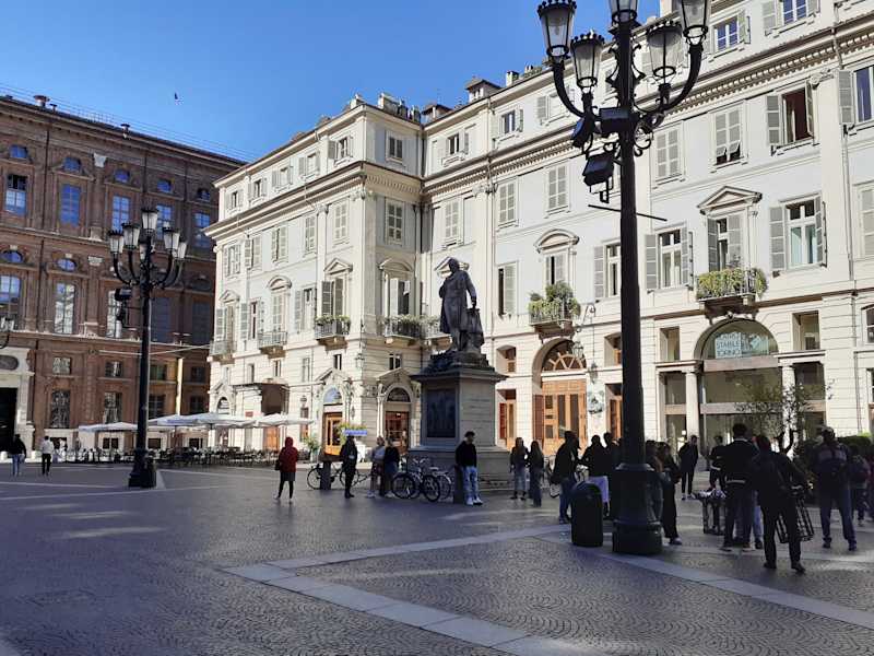 Der Platz vor dem Palazzo Carignano ist ein authentisches urbanes Juwel im Herzen der Stadt, etwas abseits von der zentralen Via Roma. Eine Seite des Platzes wird von dem majestätischen Palazzo mit seiner wellenförmigen roten Backsteinfassade dominiert, gegenüber steht das Teatro Carignano, das ebenfalls ein kleines architektonisches Juwel ist. Weitere elegante historische Gebäuden und charmante Cafés vervollständigen die Bebauung des Platzes. In der Mitte des Platzes steht die Statue von Vincenzo Gioberti, einem italienischer Politiker und Philosophen des 19. Jahrhunderts, der ein „vereintes Italien unter päpstlicher Führung“ anstrebte.