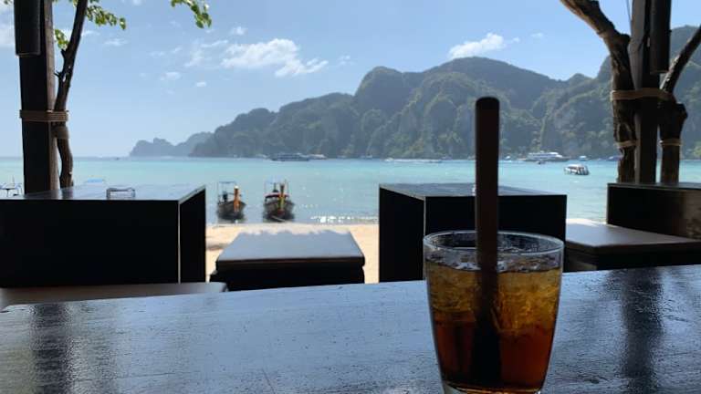 Die Carlitos Bar liegt seitlich direkt am Strand von Phi Phi Don. mit Blick auf den Hafen und die Karstfelsen. Der Ausblick ist atemberaubend. Zusammen mit ein paar Cube Libre mit Mekhong Rum einfach toll.