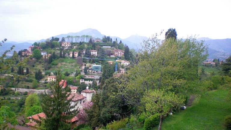Von der Cittá alta in Bergamo fährt vom anderen Ende ebenfalls eine Schienenseilbahn. Sie führt noch eine "Etage" höher in die Hügel nach San Vigilio, einem (noch) ruhigen Örtchen mit vielen Villen und einer Burgruine. Man hat fast immer einen phantastischen Ausblick, bei klarem Wetter sehr weit.