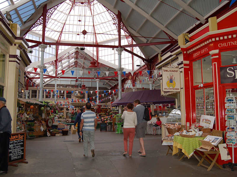Die Viktorianer waren nicht nur gut im Burgen bauen, nein auch für das Einkaufen haben sich sich einiges ausgedacht. Diese schöne Markthalle mit dem Glasdach und einen wunderschönen Brunnen im Zentrum ist unbedingt sehenswert. Das Angebot ist vielfältig. Obst, Gemüse, Fleisch, Backwaren und vieles andere kann man dort einkaufen. Ein spezieller Shop für Spezialitäten aus Jersey, z. B. die "Black Butter" oder das leckere Joghurt von den Jersey Kühen sollte man probieren. Wer möchte kann auch französisches Gebäck einkaufen, oder an einem der Stände Tee mit Scones probieren. Aber es ist anzuraten, rechtzeitig zu kommen. Wir waren an einem Tag gegen 17 Uhr da und haben gerade noch einen Tee mit Gebäck bekommen. AndererLänder- andere Sitten Man richtet sich sehr früh auf den Feierabend ein, das fanden wir etwas merkwürdig. Wir sind halt doch an unsere Öffnungszeiten gewöhnt.