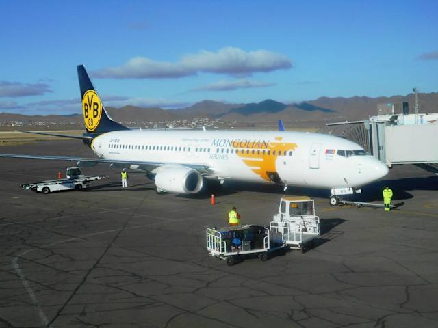 Das habe ich nicht schlecht gestaunt, als ich am 1.10.2016 von Ulaanbaatar nach Berlin fliegen wollte und am Chinggis Khaan International Airport stand eine Maschine der mongolischen Fluglinie MIAT mit dem Logo des BVB Dortmund zum Einsteigen bereit (siehe Foto). Aber außer dem Logo auf dem Flugzeug erinnerte nicht viel an Dortmund – außer vielleicht noch der Größe des Flughafens. Der vor 20 Jahren modernisierte Flughafen von Ulaanbaatar hätte inzwischen wieder mal eine Generalüberholung nötig – es funktioniert so einiges nicht mehr. Aber es soll ein neuer Flughafen gebaut werden, und da spart man wohl an der Instandhaltung für das alte Terminal. Trotz einiger Macken funktionierte die Abfertigung unserer Maschine dann aber doch pünktlich.