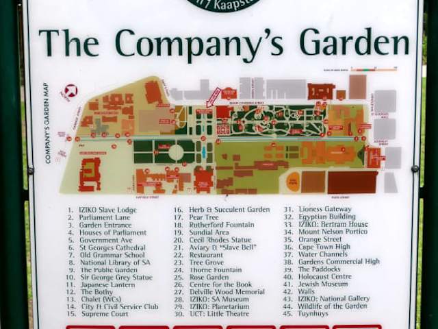 Man könnte Company Gardens auch als zentralen Stadtpark von Kapstadt bezeichnen.Am Ende der Adderley-Sraße liegt er sehr zentral.Ursprünglich in der Zeit der holländischen Besiedlung als Anbaufläche für Obst und Gemüse für die Segler der Holländisch-Ostindischen Handelskompanie vorgesehen verwandelte sich diese Anlage in eine sehenswerte Parkanlage.Große ud kleine unterschiedliche meist tropische Bäume, herrliche Blumenrabatte mit bunt blühenden Blumen,im oberen Teil große Rosenbeete und verschiedene Teiche mit Wasserspielen prägen den Park.Der Park wird von den Kapstädtern gern zur Erholung,als Treffpunkt für ein Rendezvous und auch als Rastplatz in der Mittagspause genutzt.Um den Park herum befinden sich bedeutende Museen und viele Schgulen.Diverse Vogelarten bevölkern den Park, unzählige graue zutrauliche Eichhörnchen und leider auch tausende Tauben sind im Park zu finden.Bei Einbruch der Dunkelheit wird das Kerngelände aus Sicherheitsgründen abgeschlossen-