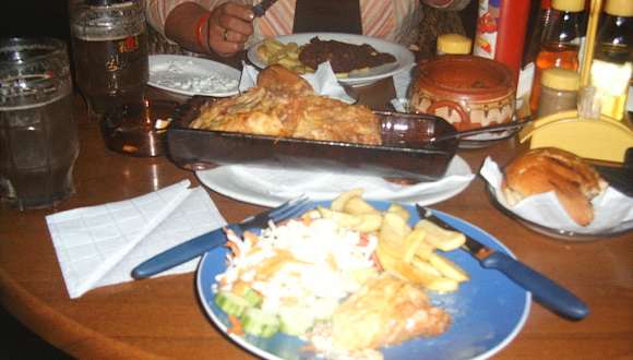 =Condor Bar= im dunklen grün angeschrahlter baum neben der Post ´. Riesenspiess 7, 60 Lewa-schnitzelhawai 9, 90 Lecker , pfefferstaek 9, 90 ... cocktails mai-tai 250ml 3, 50lewa ,cuba libre 70ml 2, 90lewa...