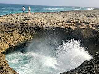 Am nördlichen Ende Curaçaos findet sich ein abgeschiedener Ort, der in seiner schroffen und ursprünglichen Art fasziniert und einen Besuch lohnt: Watamula. Stetig brechen sich die Wellen mit ungeheurer Gewalt an den Korallenformationen und Basaltfelsen der Küste - im Gischtnebel entstehen Regenbogen und einsame Angler versuchen in der Brandung ihr Glück. Wer die Region durchstreift, kommt schnell zur namensgebenden „Wassermühle“, einem etwa 10 Meter runden Loch im unterspülten Uferplateau, in dem das Wasser geradezu „kocht“. Die Anfahrt ist einfach und ausgeschildert: Ab Sabana Westpunt und der „Kurá Hulanda Lodge“ geht es in einen unbefestigten Weg, der nach etwa 2 Kilometern an einem kleinen Parkplatz endet. Die unzähligen Glassplitter auf dem Boden und ein entsprechendes Schild warnen davor, Wertsachen im Auto zu lassen.